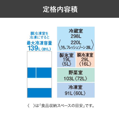 冷蔵室:298L <220L>うち、フレッシュゾーン26L