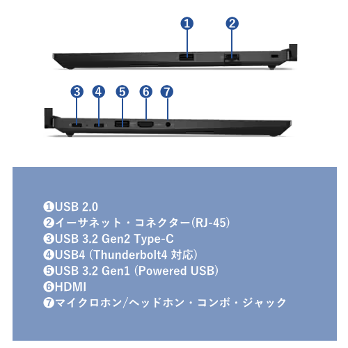 インテル Wi-Fi 6 (IEEE802.11ax/ac/a/b/g/n準拠)(MediaTek 7921)、Bluetooth v5.3インターフェース USB(Type-C):USB 3.2 Gen2 (Video-out 対応) x 1、USB4 (Thunderbolt4 対応) x 1、USB(Type-A):USB 2.0 x 1、USB 3.2 Gen1 (Powered USB) x 1、HDMI×1、RJ-45 x1、マイクロホン/ヘッドホン・コンボ・ジャック×1 セキュリティチップ TCG V2.0準拠 リカバリ Officeソフト 非搭載 寸法 約 幅313x奥行219.3x高さ18mm 重量 約 1.44kg~ バッテリー駆動時間(最大) 消費電力 最大 65W 電源 3セルリチウムイオンポリマーバッテリー47Whr 、ACアダプター 付属品 電源コード、Lenovo USB Type-C 65W ACアダプター、マニュアル類 メーカー保証期間 1年間引き取り修理 備考 ※寸法は突起部含まず。