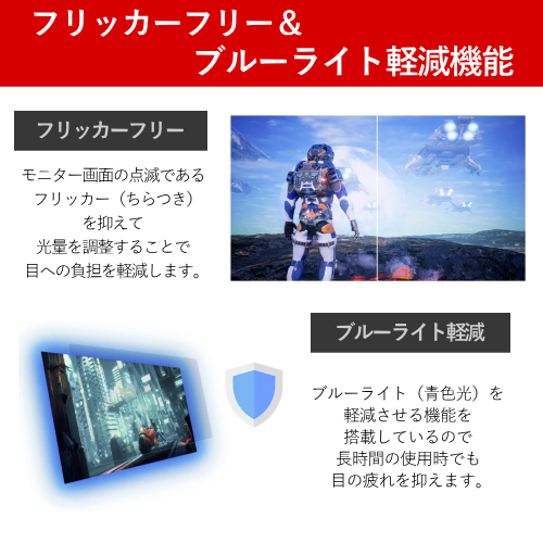 【機能】AdaptiveSync(FreeSync)、フリッカーフリー(ちらつき軽減)ブルーライト軽減モード、HDCP(1.4)