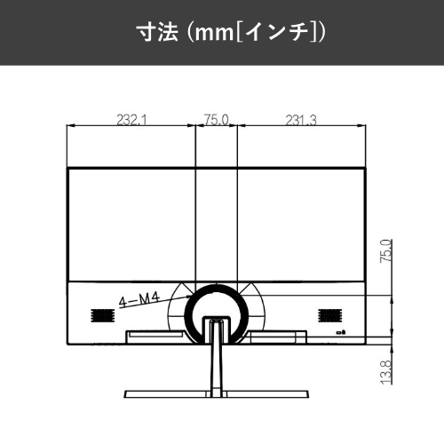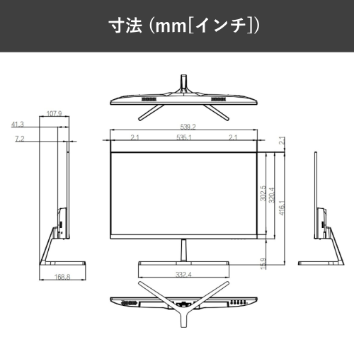 主な仕様 ディスプレイサイズ 23.8インチ パネル種類/タイプ IPS パネル / LEDバックライト アスペクト比 16:9 解像度/表示色(最大) 1,920×1,080(フルHD)/1670万色 コントラスト比 1000 : 1 輝度(最大) 250 nit 視野角 178°(水平)/178°(垂直) 応答速度 5ミリ秒 スピーカー 1 W × 2 電源 DC 12 V、2.5 A 傾斜角度 - 5° ± 2° / 15° ± 2° VESA 75 x 75(mm) その他機能 ブルーライト低減機能 接続端子 HDMI 1.4 × 1、VGA × 1 消費電力 最大:30W/待機時:0.5W以下 外形寸法 幅 539.2 x 高さ 320.4 x 奥行41.3mm(スタンドを除く) 質量 2.82 kg 付属ケーブル HDMI 1.4ケーブル、アダプター、スタンド、その他 メーカー保証 3年間